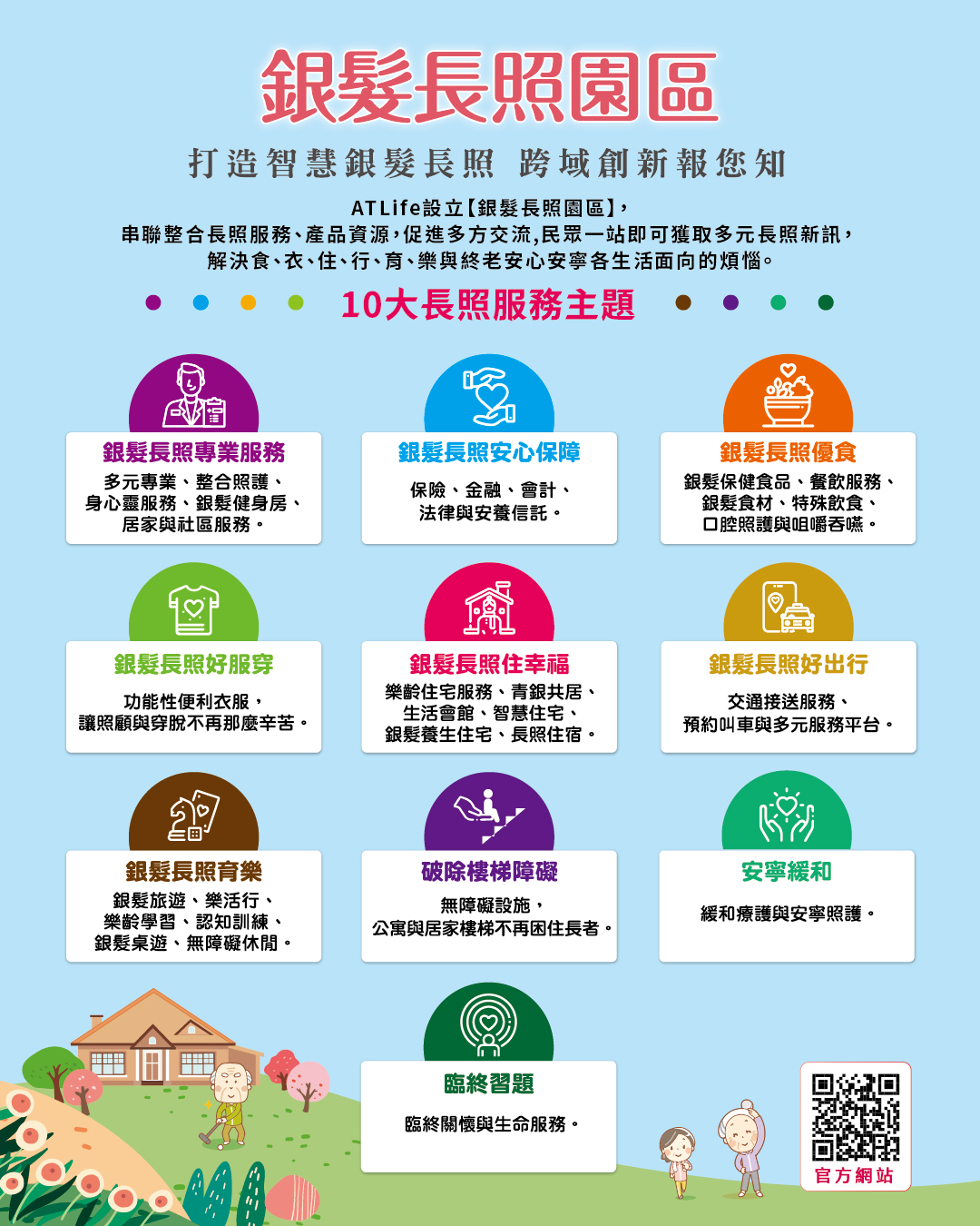 ATLife設(shè)立【銀髮長照園區(qū)】,串聯(lián)整合長照服務(wù)、產(chǎn)品資源,促進多?交流,民眾一站即可獲取多元長照新訊,解決食、衣、住、行、育、樂與終老安心安寧各生活面向的煩惱。
