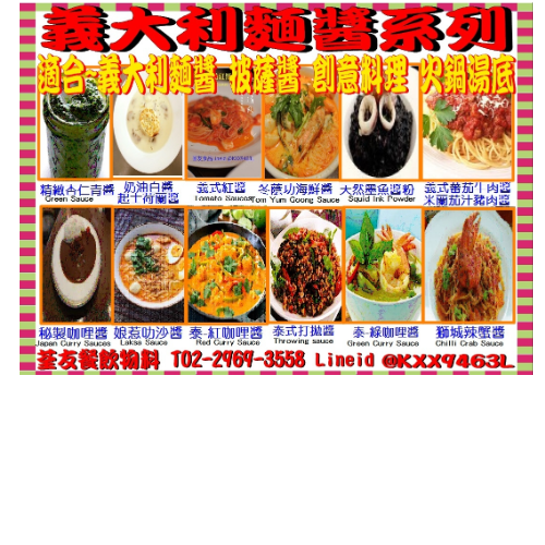 首頁 / 參觀資訊 / 2025 參展商產(chǎn)品 / 各式義大利麵醬 義式紅醬 青醬 白醬 義式肉醬 北海道起士醬 墨魚醬 叻沙醬 辣蟹醬 打拋醬 冬蔭功醬.....