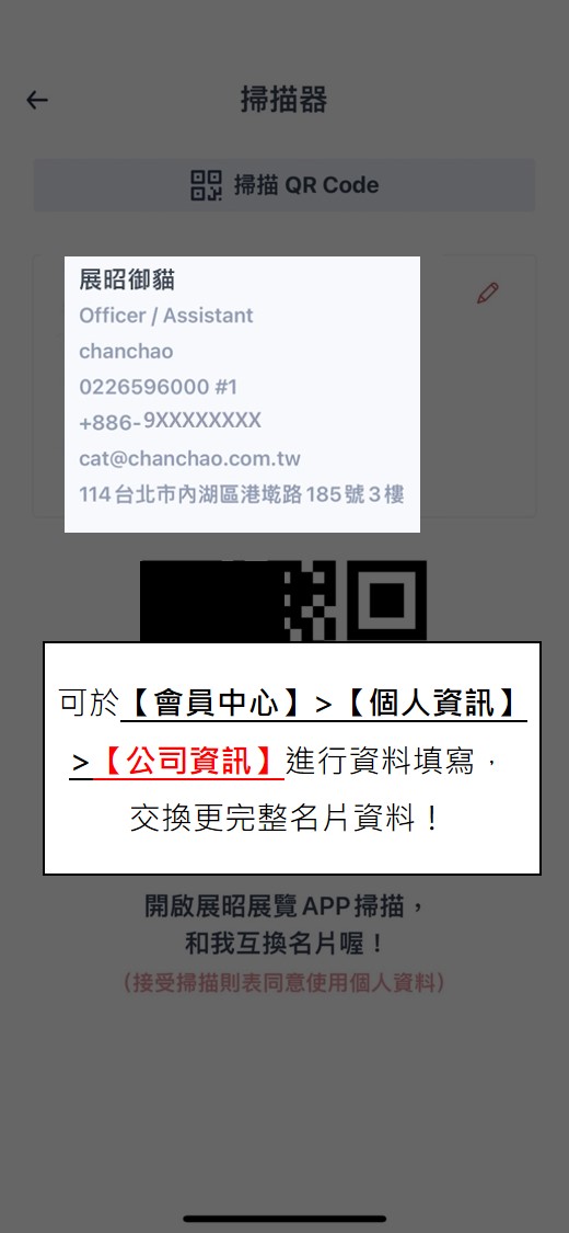 ※可於【會(huì)員中心】>【個(gè)人資訊】> 【公司資訊】進(jìn)行資料填寫(xiě),交換更完整名片資料!