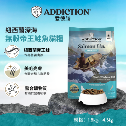 ADD愛德勝帝王鮭魚貓糧,選用紐西蘭深海帝王鮭魚,位於配料首位,含Omega3及螯合礦物質(zhì)