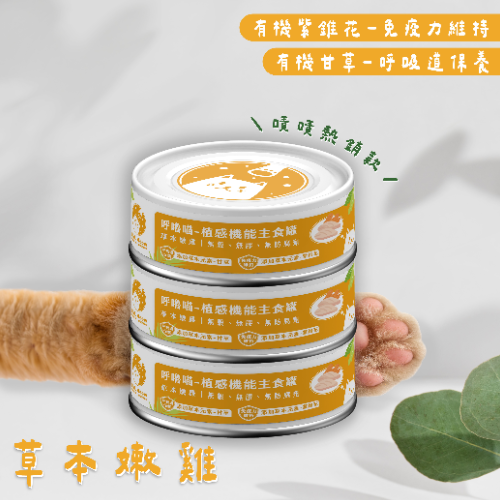呼嚕喵主食罐均為無穀、無膠、無澱粉,並添加有機(jī)草本,讓貓咪們邊吃邊保養(yǎng)!<br/><br/>草本嫩雞口味添加有機(jī)草本-紫錐花和甘草。<br/><br/>在草本選擇上,呼嚕喵堅持從友善環(huán)境的廠商購入原材料。<br/>選用來自美國,並擁有美國 USDA 及 QAI 有機(jī)認(rèn)證的紫錐花;<br/>以及來自印度,擁有美國 USDA 有機(jī)認(rèn)證的甘草粉。<br/><br/>紫錐花可以促進(jìn)呼吸道保健、維持免疫力及抵抗力,並幫助皮膚維持健康。<br/>甘草促進(jìn)呼吸道保健、護(hù)膚,並幫助消化、維持消化道機(jī)能。<br/><br/>主要成份:雞肉、雞肝、雞心、有機(jī)細(xì)研甘草、有機(jī)紫錐花、複合維生素(維生素A. B1. B2. B3. B9. B12. D. E)、綜合礦物質(zhì) (鈣. 磷. 鎂. 鋅. 鐵. 錳. 銅. 碘. 鉻. 硒)、雞油、蛋黃粉、洋車前子、綜合胺基酸、?;撬?、酵母
