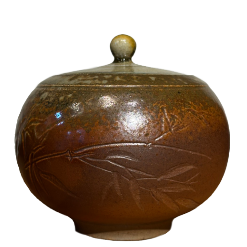 《竹影》以竹為題,象徵堅(jiān)韌與清雅。壺身刻紋在火焰中被柚木灰覆蓋,高溫下的油脂燃燒使表面泛出自然光澤,讓竹紋在光影間若隱若現(xiàn)。深褐與橄欖綠的漸層,如月色下的竹林,靜謐而生動(dòng)。每一道火痕與落灰的流跡,都是時(shí)間留下的氣息,柔中帶勁,靜中有力。