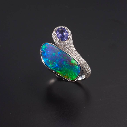 主石為澳洲蛋白石,搭配無燒藍寶及鑽石,整體造型以生動的流線型設計,締造出獨一無二的張力美,蛋白石變幻多彩的遊彩現(xiàn)象造就使人驚艷的變幻之光,緊鄰主石的流線上鑲嵌未加溫藍寶與象徵不變、穩(wěn)定存在的鑽石,勾勒出其特有的意涵:「幻象中的真實、流動中的不變?!?
