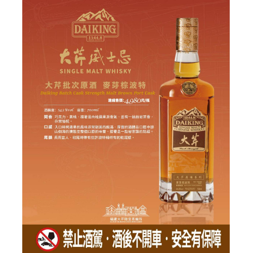 After being steeped in Porter barrels for a long time, the aromas of chocolate and fruit, along with a full-bodied and creamy texture reminiscent of grains, fill the mouth, like a chocolate chip cookie dipped in orange syrup. It's like being in a wheat field, with endless waves of wheat stretching to the horizon. Ah, the wheat is ripe, its fragrance lingering long after.<br/><br/><br/>ABV:54.3% vol<br/>Capacity:700ml<br/>selling price: NT$4980<br/><br/><br/>NOSE<br/>Chocolate and yellow peach aromas followed by cinnamon apple pie notes, with a hint of Wuyi rock tea—very pleasant.<br/><br/>TASTE<br/>The initial taste is a sweet and full-bodied baked apple flavor. The robust body spreads powerfully throughout the palate, followed by a touch of Wuyi rock tea.<br/><br/>FINISH<br/>Long and pleasant, with a slight dryness characteristic of Port casks at the end.
